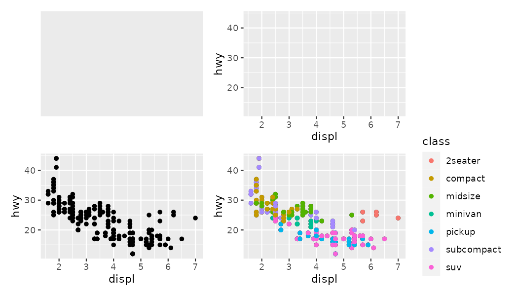 Faceting is a way to trade off some discrete aesthetic (e.g. hue) for position. It generates multiple subsets of the data (filtered by the values of some typically categorical variable) and shows them side by side. In this tutorial, the three kinds of facets available are explored as well as how they interact with position scales.