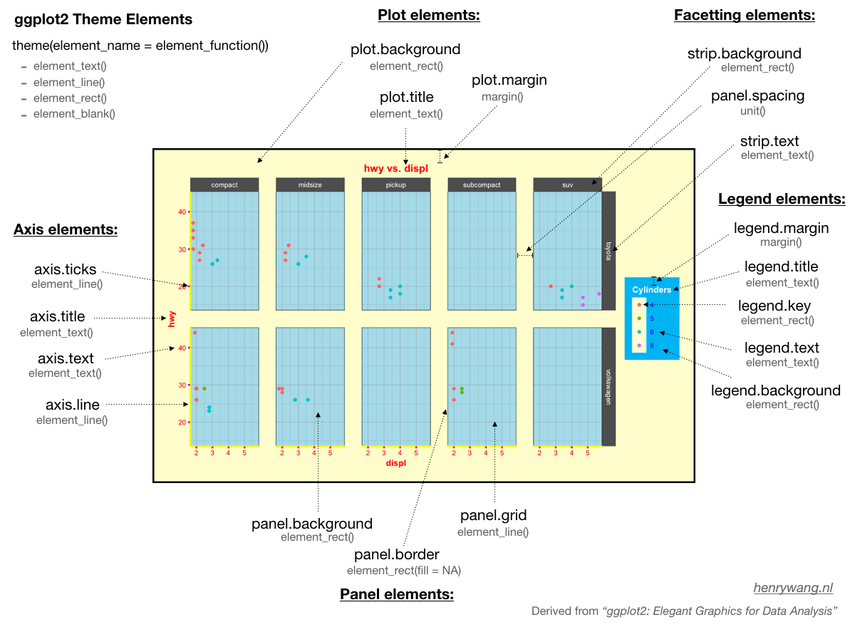 The final piece in the ggplot2 equation is theming. The powerful theme system does not affect any perceptual properties of the plot, but it help us make production-quality graphs through a fine control over things like fonts, ticks, panel strips, backgrounds...