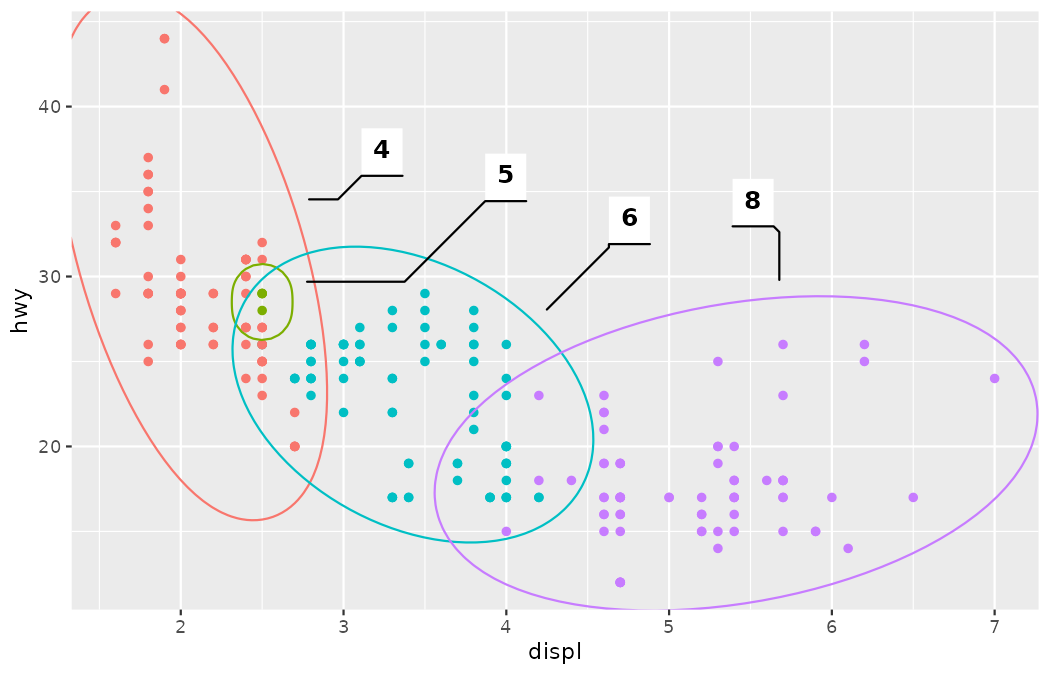 When constructing a graph, it is often necessary to make annotations to the data displayed. Annotations provide the necessary context to direct the reader's attention and build an effective story. This metadata, as a form of data, will use the same geoms and tools that we already know. However, there are some helpers, in ggplot2 as well as other extension packages, that may be useful for certain special use cases.